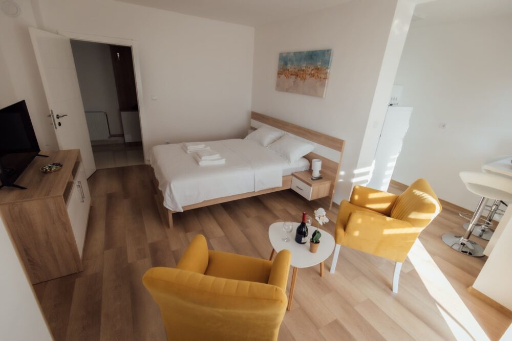 Nudimo vam moderan,luksuzan i udoban smeštaj. Stan je opremljen klimom, Wi-Fi, Smart TV-om, balkonom, parking mestom . Prostor ima 35 m2, podeljen na kuhinju, kupatilo i spavaću sobu.